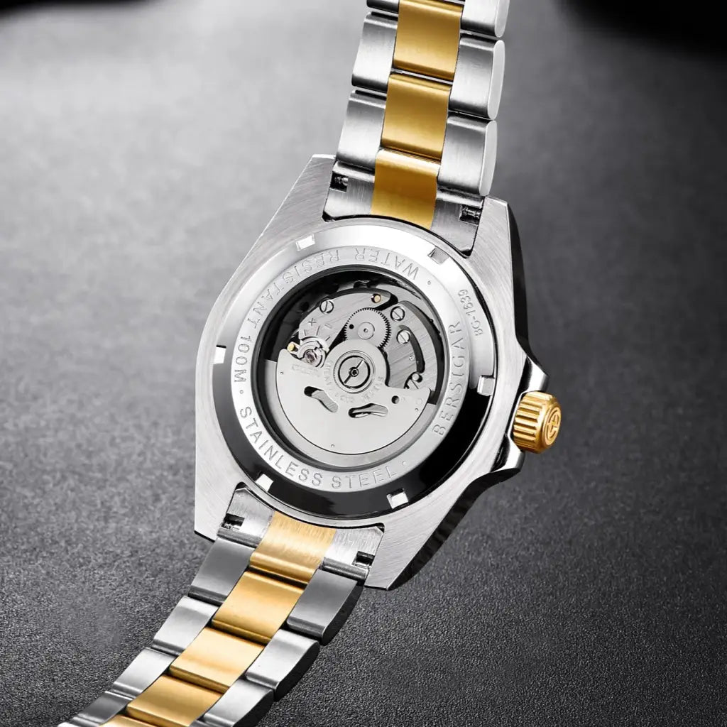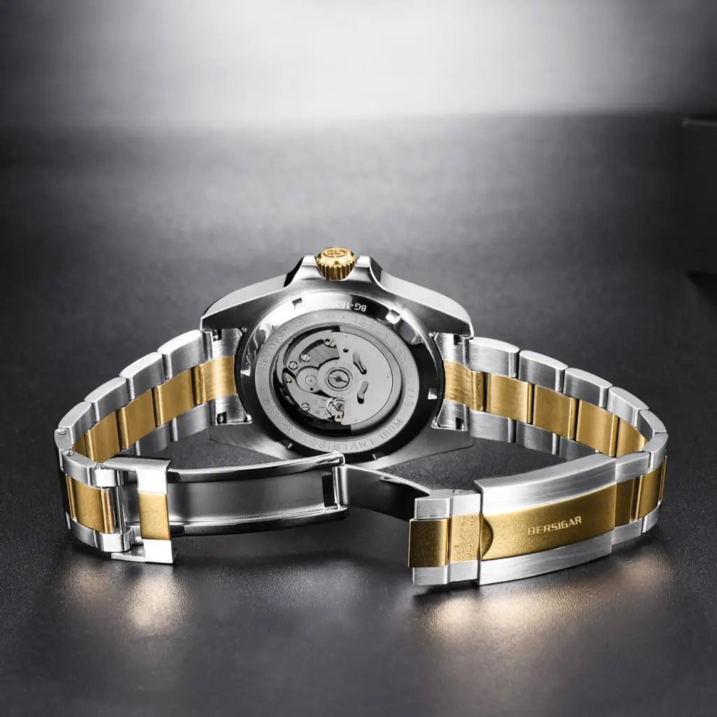 LUXAURA 1639 TWOTONE BLUE Premium materials and casual design, Sapphire dial window, full 316L stainless steel construction with screw-down crown, ceramic bezel can be rotated counterclockwise and transparent case back, solid and flexible watchband with classic deployment clasp.